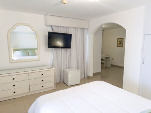 La habitación con cama queen, sala, tv cable, regadera, wifi, nevera ejecutiva, aire acondicionado.