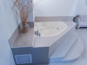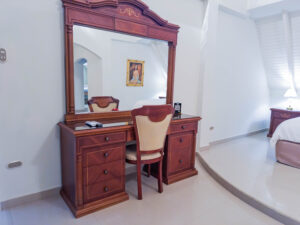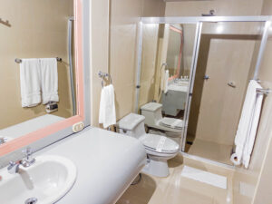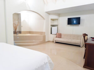 La habitación con cama King, sala, escritorio de trabajo, jacuzzi dentro de la habitación, regadera, Smart tv, wifi, caja fuerte, nevera ejecutiva, aire acondicionado.